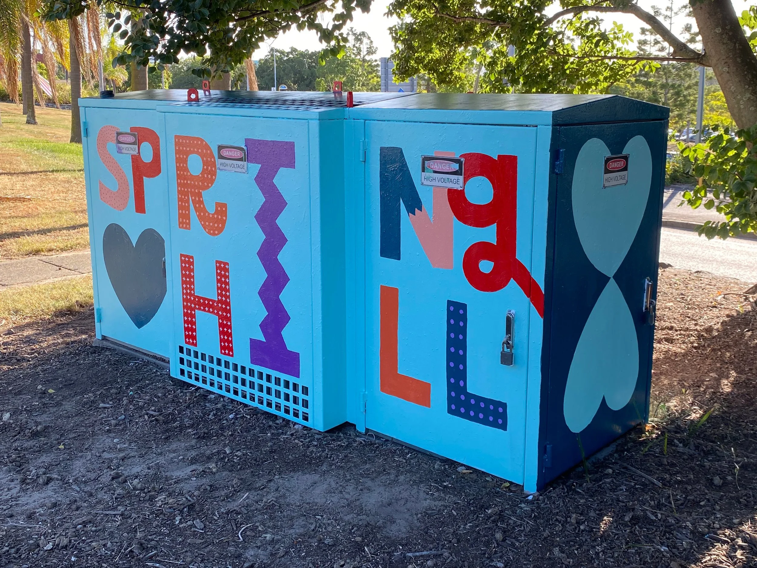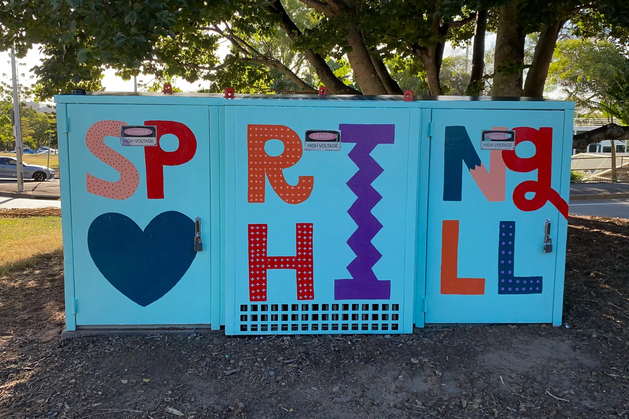 Artforce Brisbane is a community art program that gives local residents the opportunity to paint their original artworks on traffic signal boxes around Brisbane suburbs. With some help from my family, I designed and painted a typographic exploration of Spring Hill that celebrates the suburb’s gridded plan, peaks and valleys and colourful and eclectic nature.