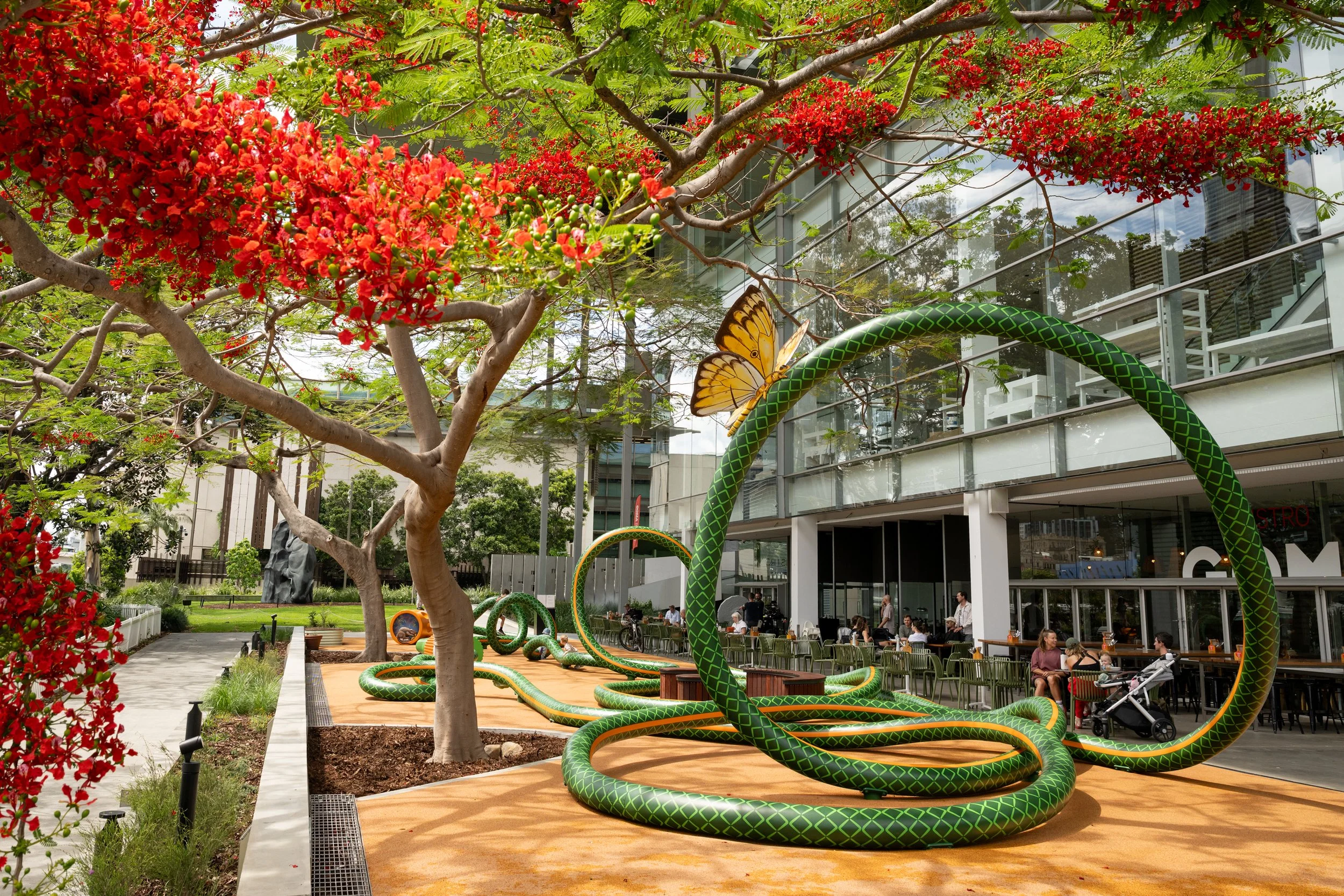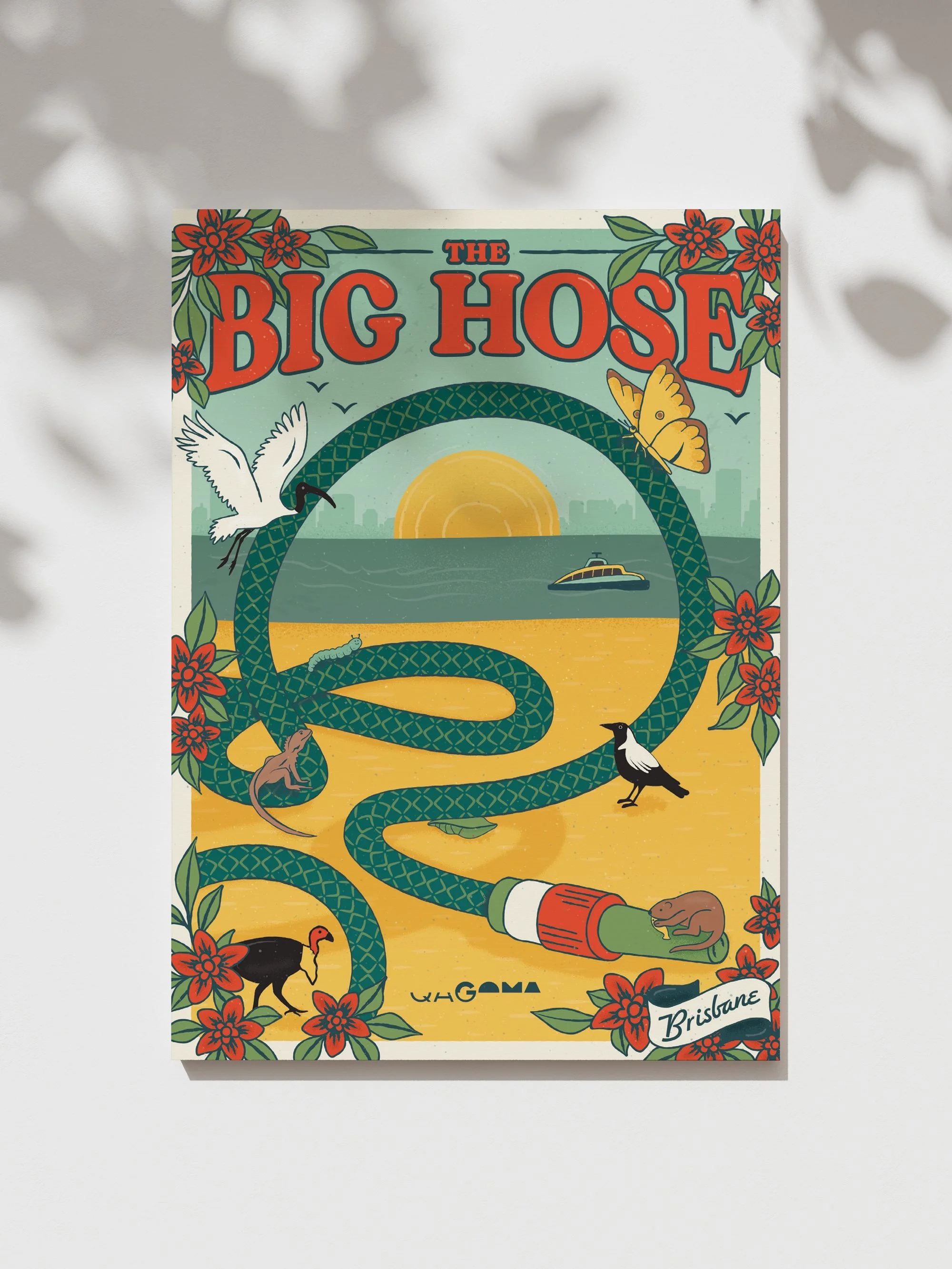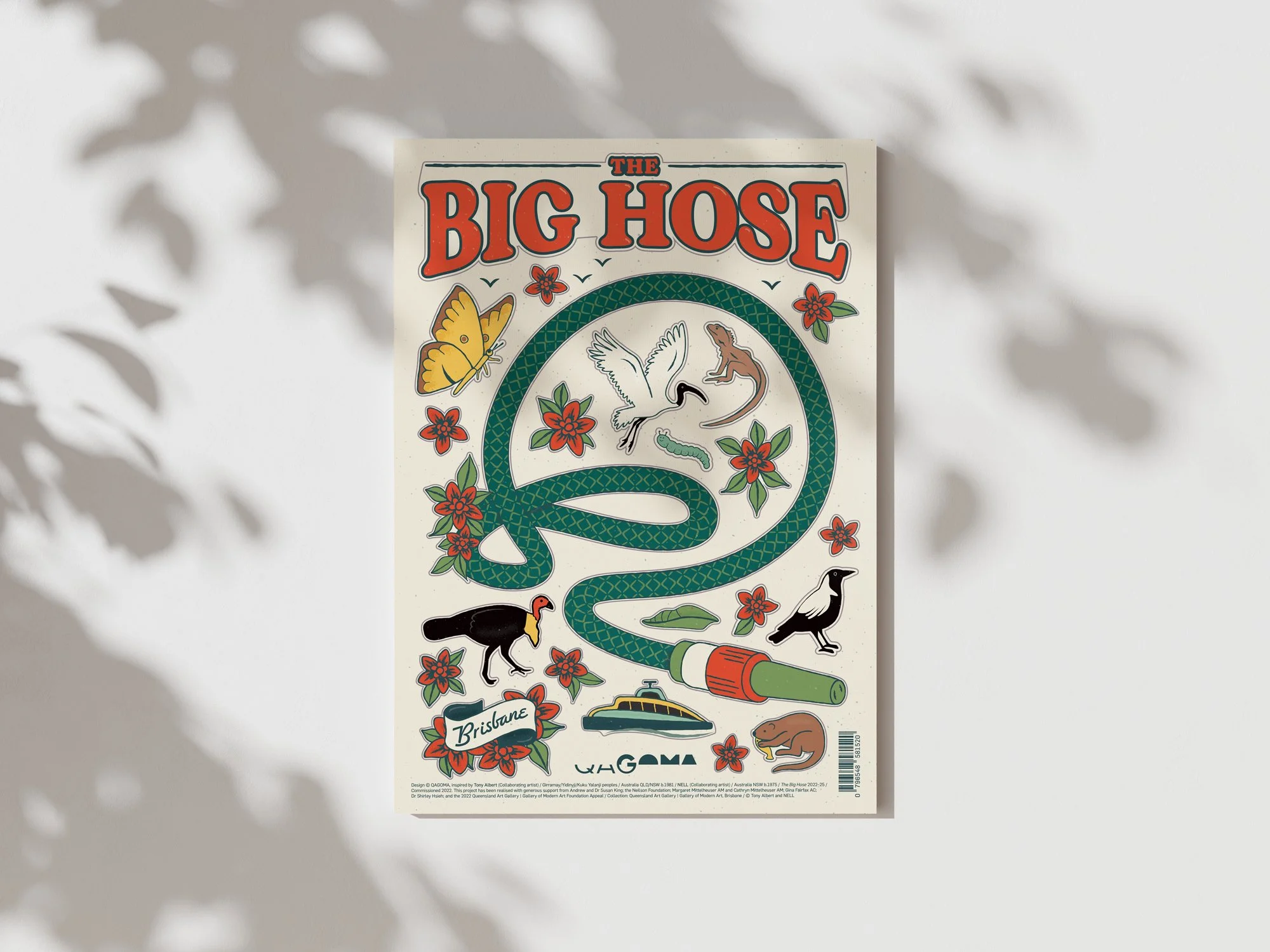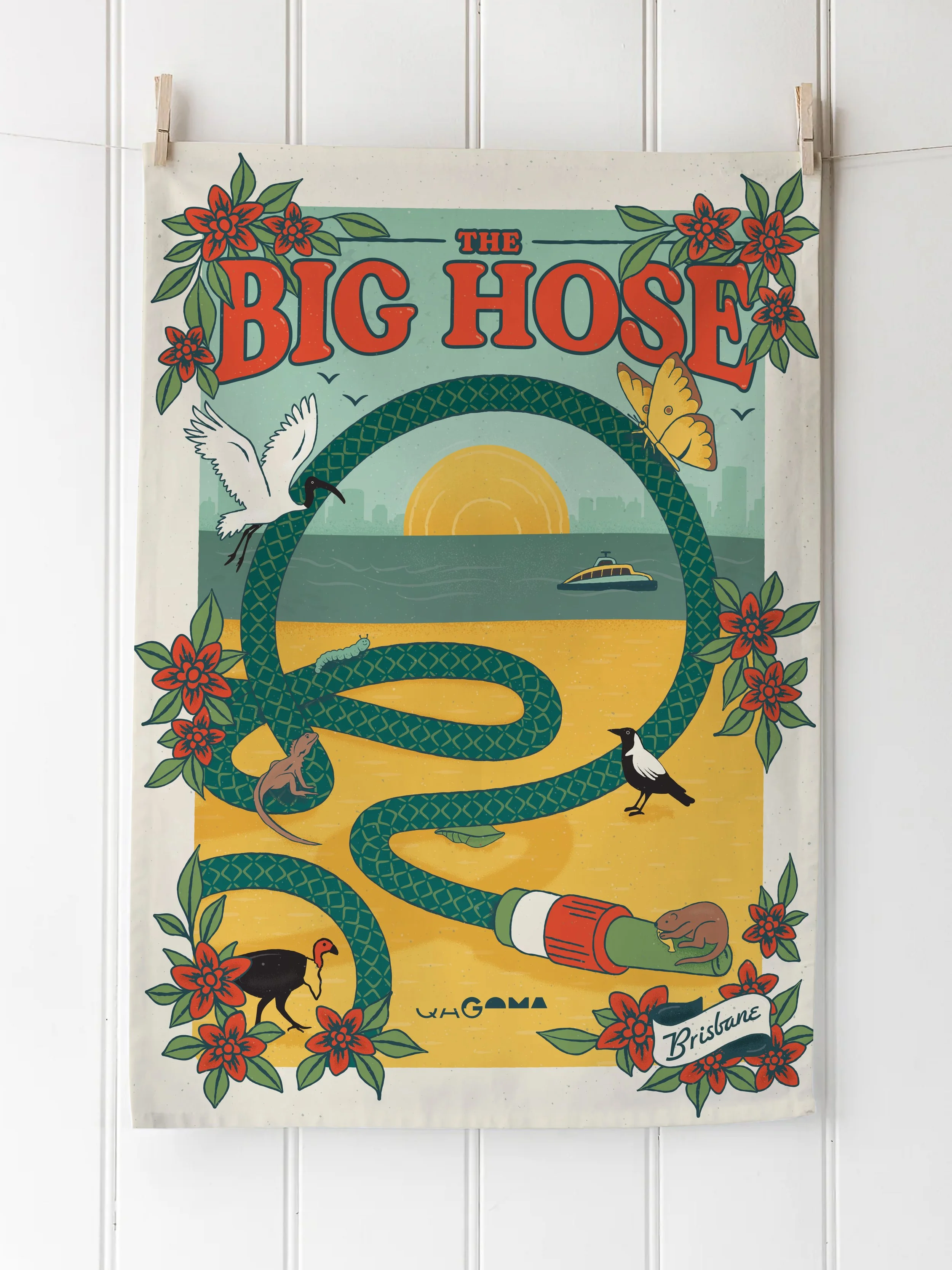 To mark the launch of QAGOMA’s new play sculpture The Big Hose by artists Tony Albert and Nell, I designed a fun range of merchandise for the gallery store. The collection includes tea towels, postcards and sticker sheets, all featuring a retro aesthetic inspired by vintage Queensland design. Images courtesy of QAGOMA.